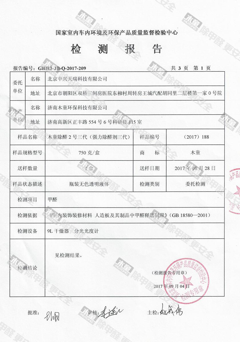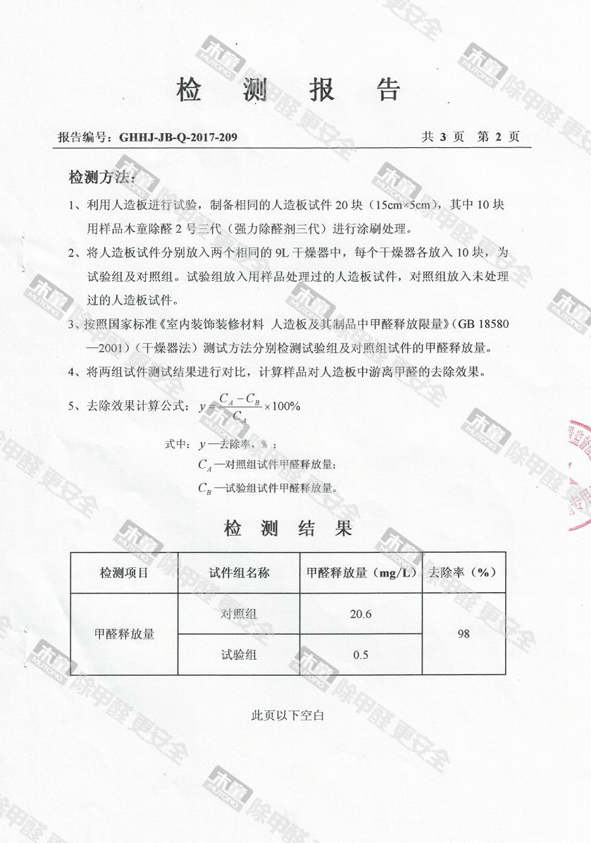 木童除醛2號三代效果檢驗報告2017