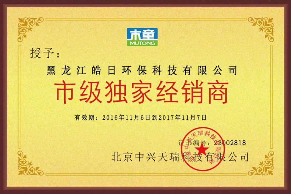 木童除甲醛產(chǎn)品市級(jí)獨(dú)家經(jīng)銷(xiāo)商證書(shū)