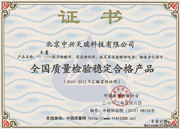 木童除甲醛、除味產(chǎn)品質(zhì)量合格證書(shū)